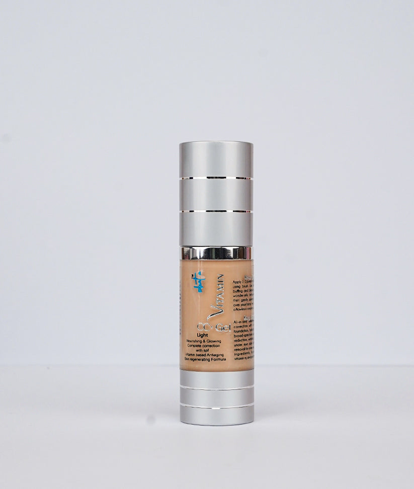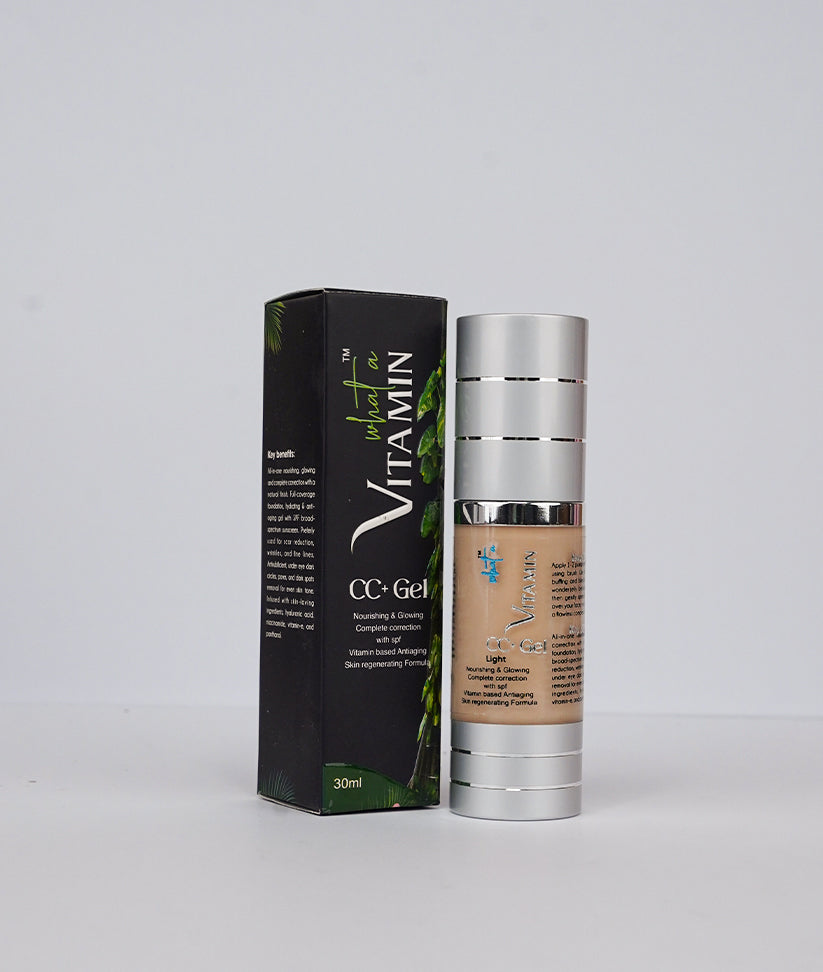 Our CC + GEL is all-in-one, Gel with SPF, a nourishing powerhouse that provides full coverage foundation with a natural finish. This hydrating and anti-aging gel is fortified with broad-spectrum sunscreen, making it your go-to solution for scar reduction, wrinkle and fine-line smoothing. Say goodbye to under-eye dark circles, pores, and dark spots as this formula works to even your skin tone effortlessly. Enriched with skin-loving ingredients like hyaluronic acid, niacinamide, vitamin E, and panthenol, it not only corrects but also cares for your skin.