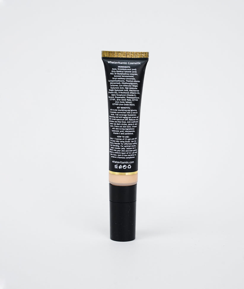 Our CC + GEL is all-in-one, Gel with SPF, a nourishing powerhouse that provides full coverage foundation with a natural finish. This hydrating and anti-aging gel is fortified with broad-spectrum sunscreen, making it your go-to solution for scar reduction, wrinkle and fine-line smoothing. Say goodbye to under-eye dark circles, pores, and dark spots as this formula works to even your skin tone effortlessly. Enriched with skin-loving ingredients like hyaluronic acid, niacinamide, vitamin E, and panthenol, it not only corrects but also cares for your skin.