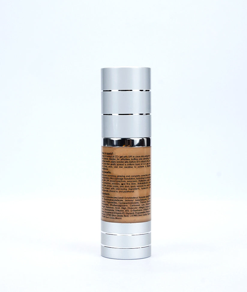 Our CC + Gel NC 25is all-in-one, Gel with SPF, a nourishing powerhouse that provides full coverage foundation with a natural finish. This hydrating and anti-aging gel is fortified with broad-spectrum sunscreen, making it your go-to solution for scar reduction, wrinkle and fine-line smoothing. Say goodbye to under-eye dark circles, pores, and dark spots as this formula works to even your skin tone effortlessly. Enriched with skin-loving ingredients like hyaluronic acid, niacinamide, vitamin E, and panthenol, it not only corrects but also cares for your skin.